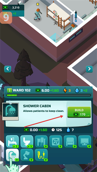 2、花费【170】资源建造【SHOWER-CABIN】,其可让患者保持清洁,提升病房的防疫配套能力,助力病毒防控。