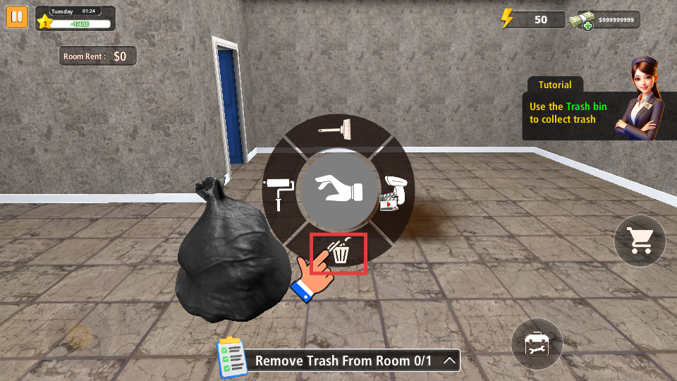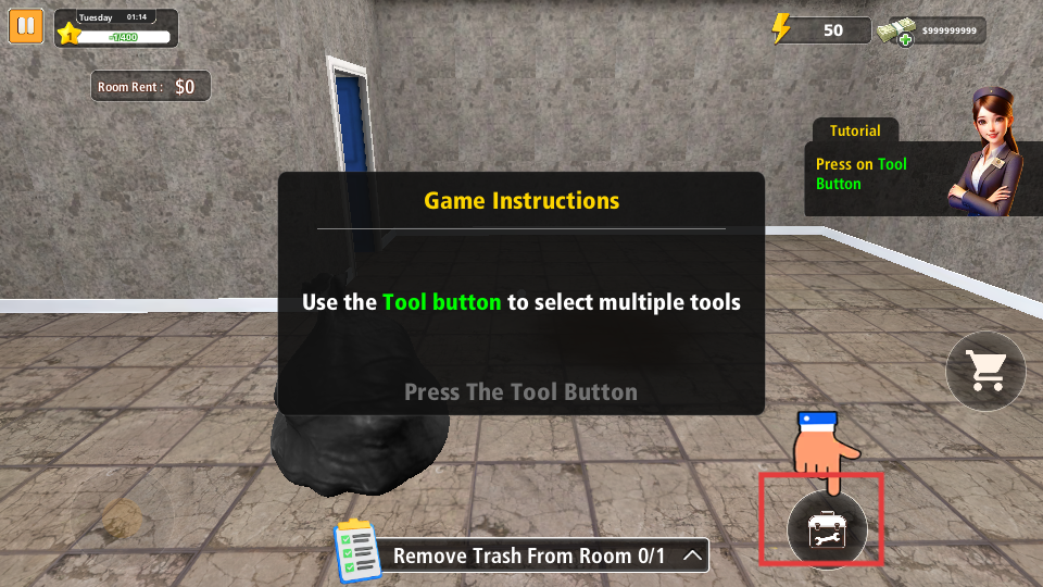 3、点击【Tool】按钮,选择工具,开始清理房间。