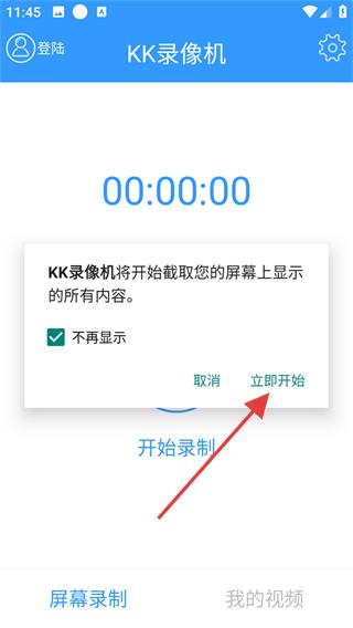 1、打开KK录像机,在弹出的提示框中点击【立即开始】,授权录屏权限。