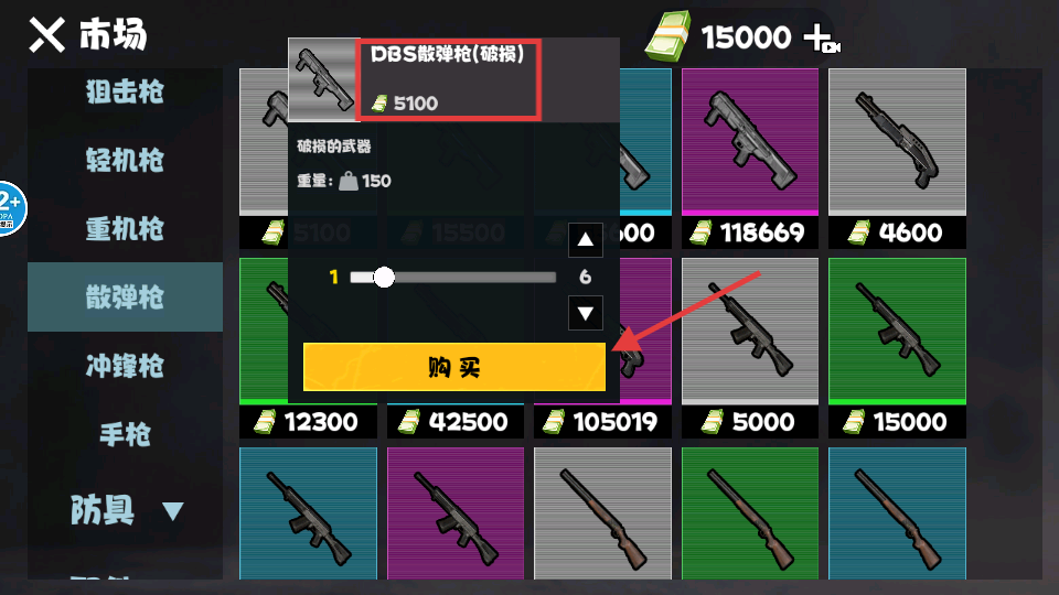 1、在游戏市场页面,可花费【5100】货币购买【DBS散弹枪-破损】,提升初期作战的近距离输出能力,为后续战斗做好准备。