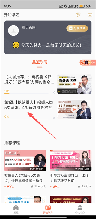2、在开始学习页,找到要分享的课程,如【第1课-以欲引人】,点击进入课程播放界面哦。
