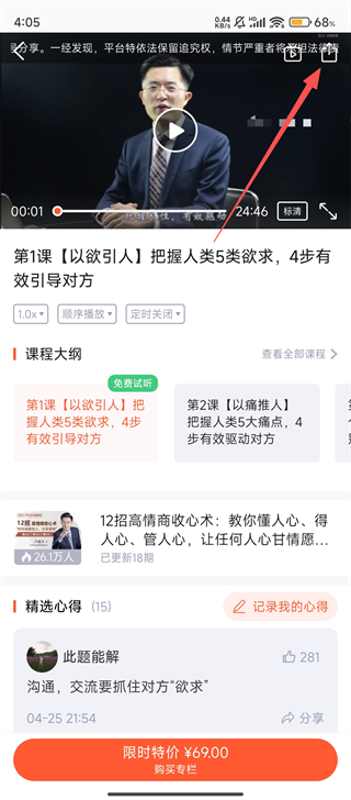 3、进入课程播放页后,点击右上角分享图标,展开分享选项呢。