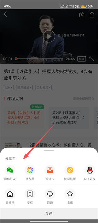 4、在分享选项中,选择【微信好友】、【朋友圈】等渠道,就能完成课程转发啦。