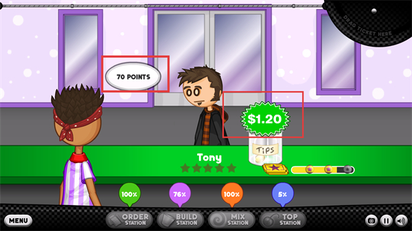 4、订单完成后,会收到顾客的评价和奖励(如70分、$1.20小费),积累分数和财富,提升游戏等级。