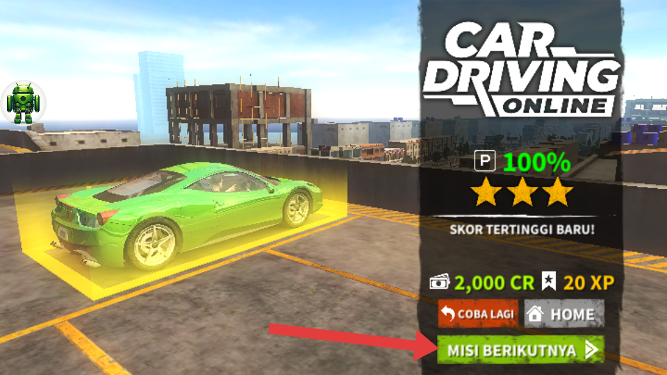 4、任务完成后,点击【MISIBERIKUTNYA】进入下一个驾驶任务,利用无限金币持续挑战,解锁更多车辆和关卡。