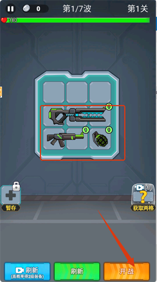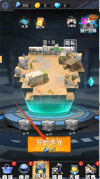1、点击【开始游戏】按钮进入第1关,注意消耗5个蓝色资源,进入前可观察界面功能入口,为战斗做准备。