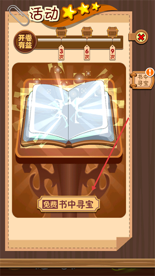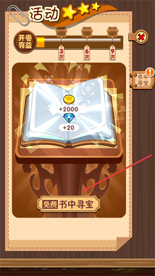1、参与“书中寻宝”活动,点击【免费书中寻宝】按钮,开启寻宝环节,获取金币、钻石等奖励。