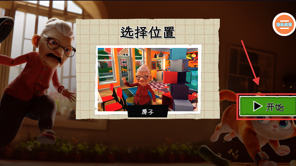 1、选择【房子】场景后点击【开始】,进入游戏开启猫咪破坏冒险,按目标破坏物品。