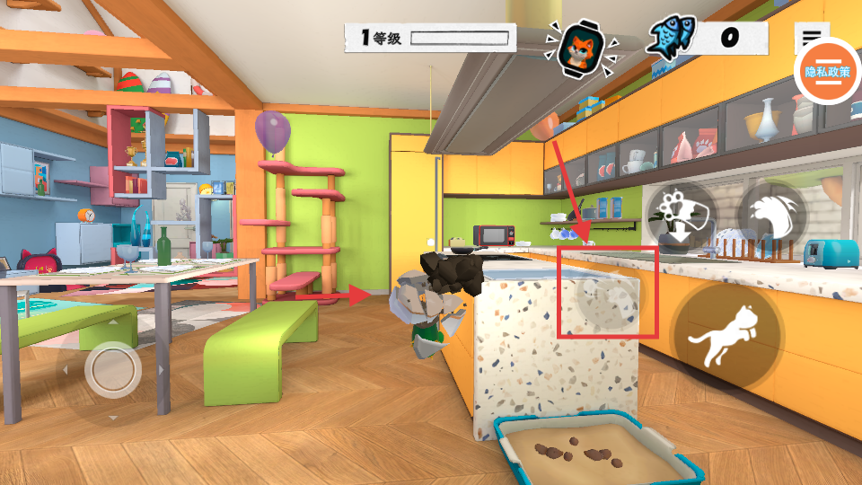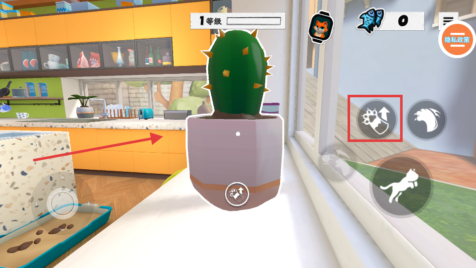 2、靠近可破坏物品(如仙人掌盆栽),点击爪子互动图标破坏,提升进度。