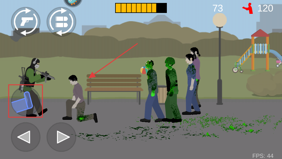 3、在公园场景通过移动按钮调整站位,避开僵尸包围并精准射击消灭目标。
