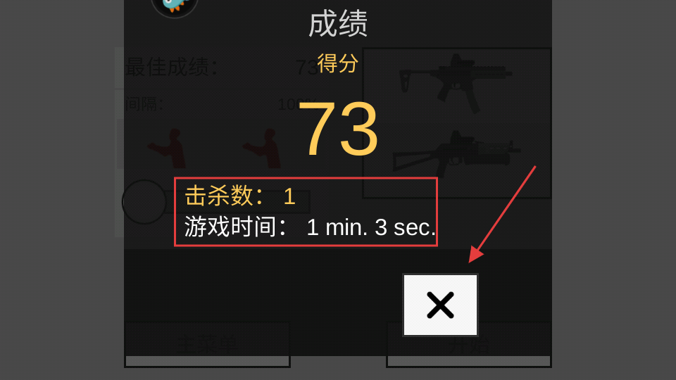 4、战斗结束后查看得分与击杀数,点击【X】关闭成绩界面可重新挑战。