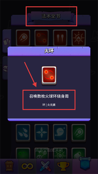 1、在【法术全书】查看【火环】法术,其效果为召唤数枚火球环绕身周(环|火元素),战斗中可借其环绕自身,输出近身敌人或防御。