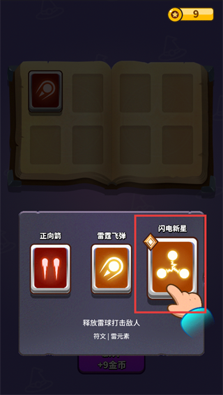 4、选择法术时优先选【闪电新星】,其为【雷元素】-【符文】类,可释放雷球打击敌人,搭配元素法术提升战力。