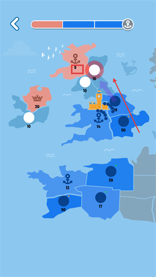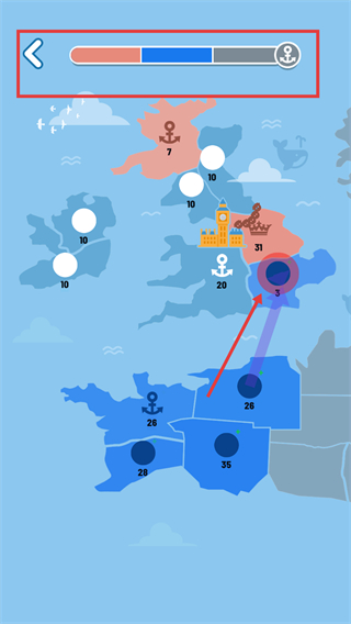 1、关注上方进度条,合理规划扩张区域,优先选择资源丰富的区域进行扩张,提升势力范围。