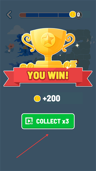 4、游戏胜利后,点击【COLLECTx3】领取奖励,积累资源用于后续扩张,提升游戏进度。