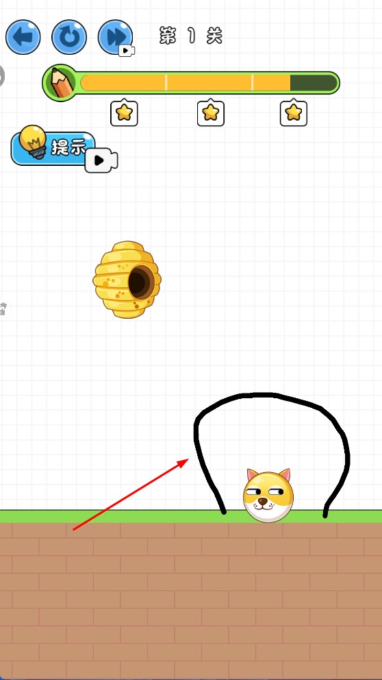 2、在【第1关】观察蜂巢位置,用一笔画圈住狗头形成屏障,阻挡蜜蜂侵袭确保安全。