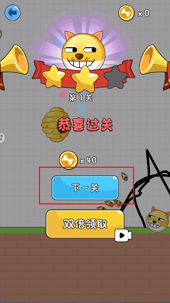 3、通关后点击【下一关】按钮继续挑战,可领取【骨头40】奖励,解锁更多关卡。