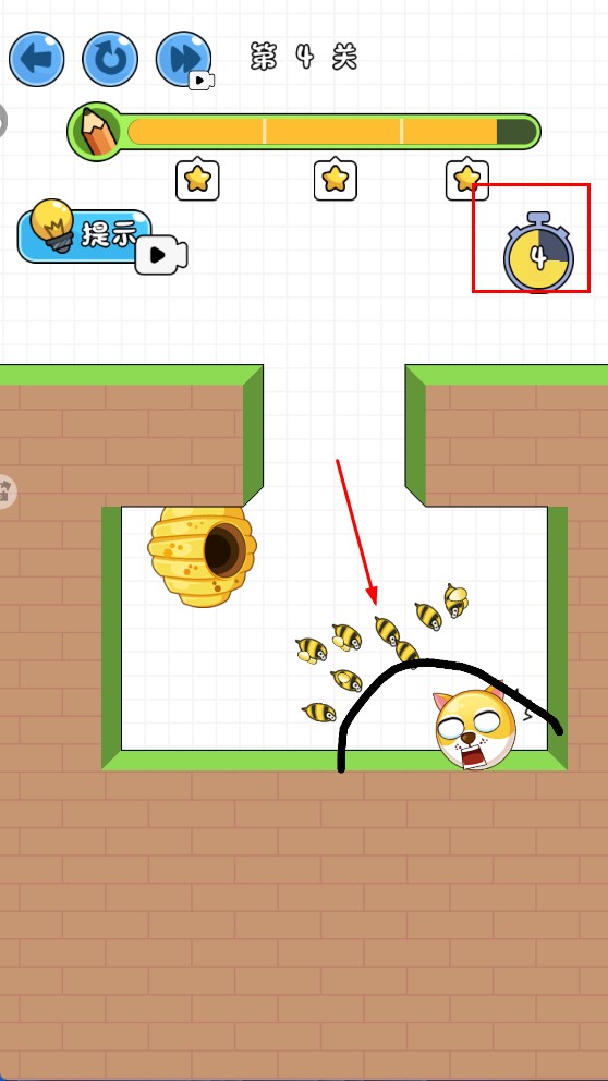 4、在【第4关】注意【时钟】提示的时间限制,快速画圈保护狗头,避开蜂群攻击。