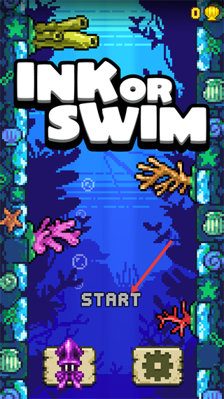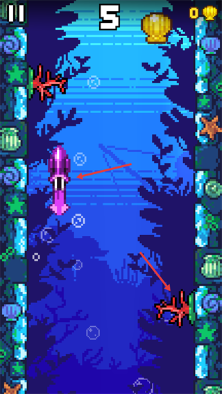 2、操控【紫色鱿鱼】角色,躲避场景中的【红色珊瑚】等障碍。
