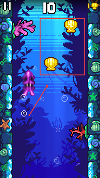 3、在移动过程中,收集场景内的【金色贝壳】道具,积累游戏分数。