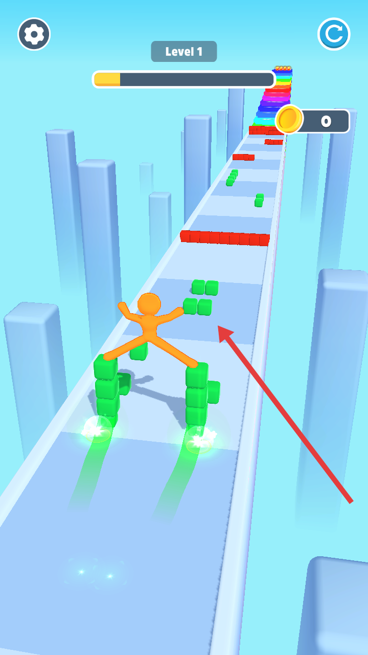 2、在路径上收集绿色方块,积累方块数量,同时避开红色障碍物。
