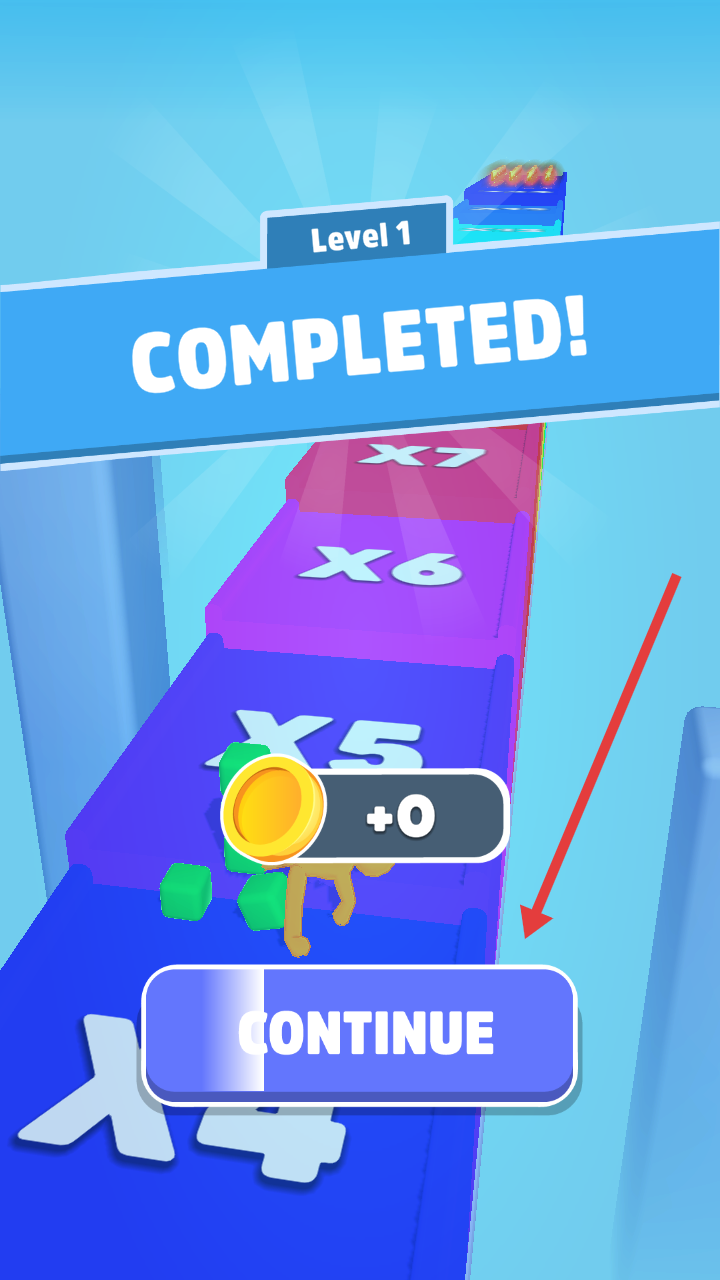 4、关卡完成后,点击CONTINUE按钮进入下一关,继续挑战并积累更多方块和分数。
