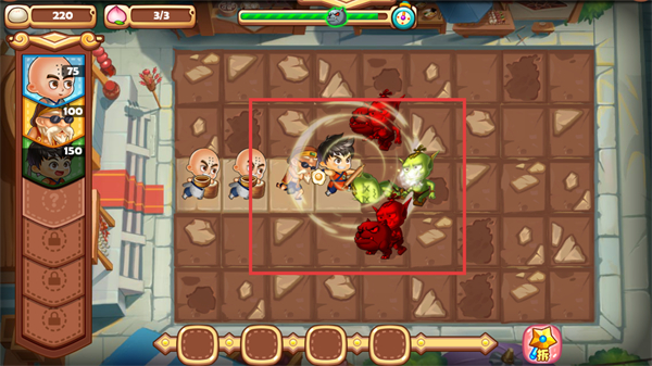 4、使用绿色豆状道具,组合多角色协同攻击,应对大量怪物围攻,确保防御阵线稳固,顺利通关。