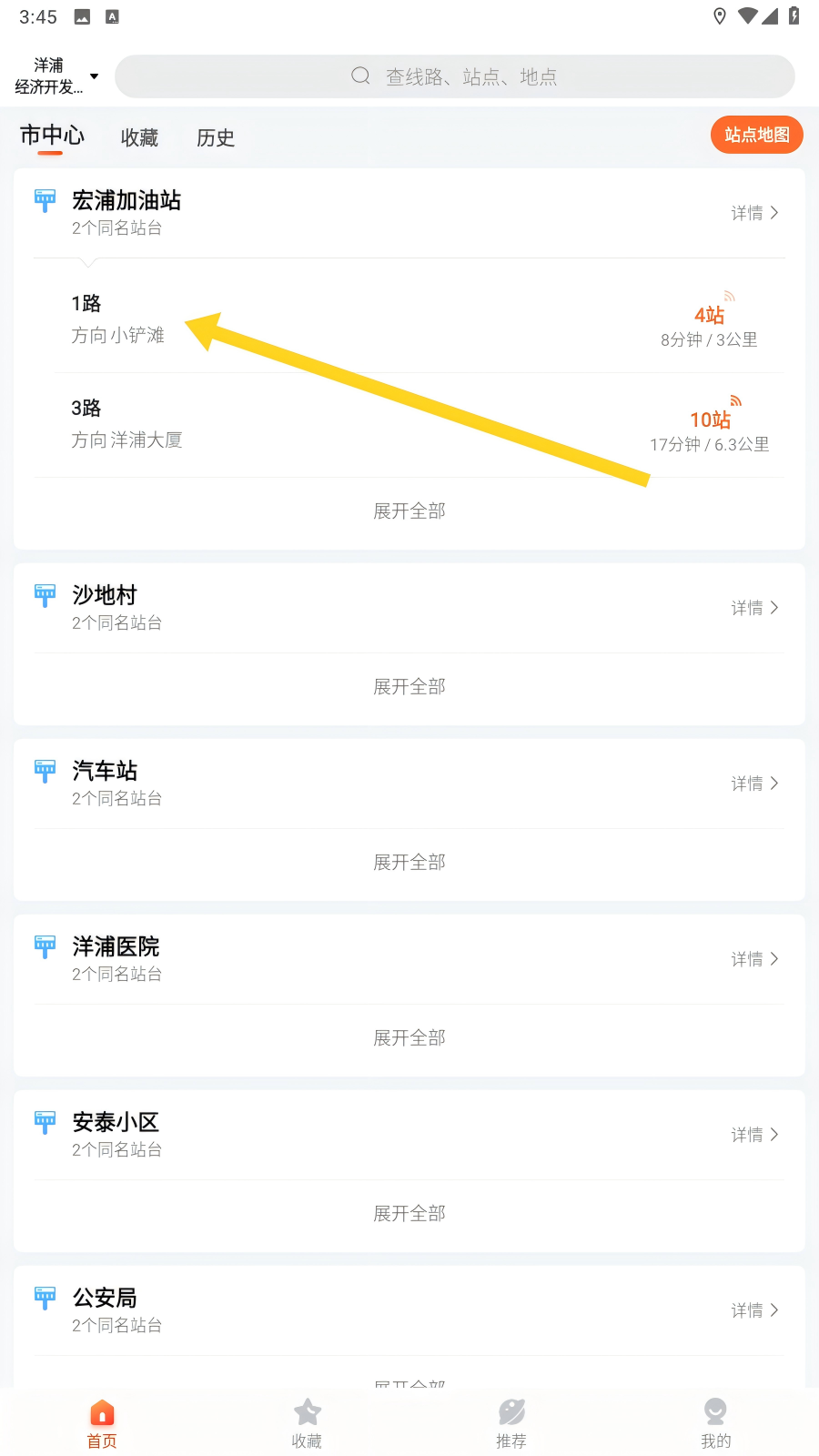 1、打开掌上公交,找到需反馈的公交线路,如【1路-方向小铲滩】,点击进入线路详情页,开启反馈流程。