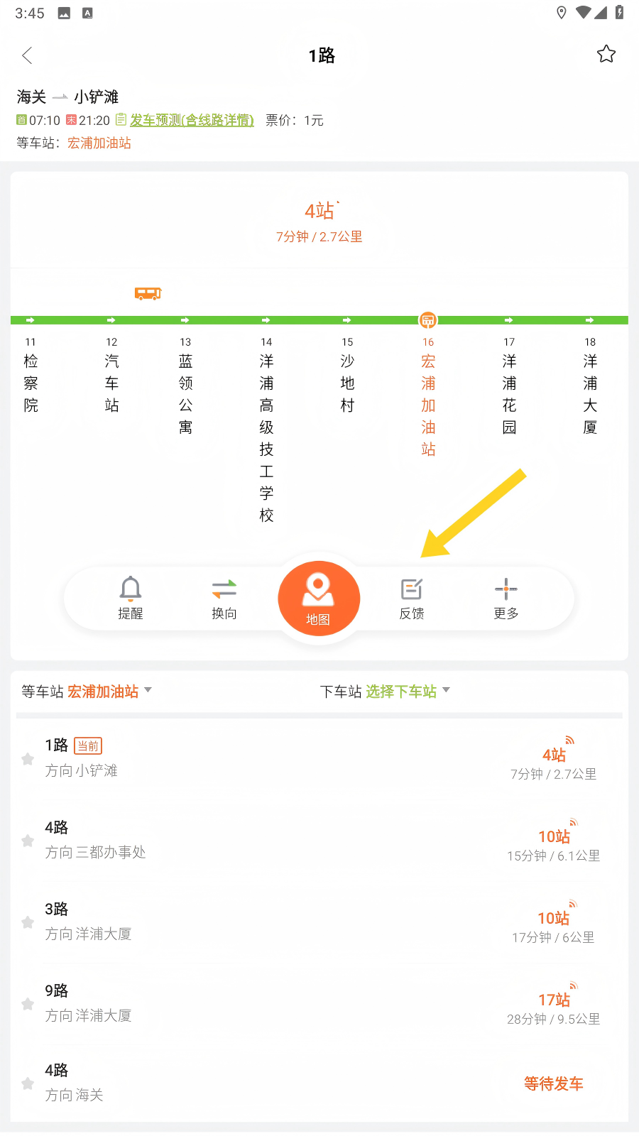在界面输入目的地,就会出现所有车站的实时位置,同时可以通过地图看到车辆所在位置,选择其中一条线路,即可知道这条线路的所有站点。