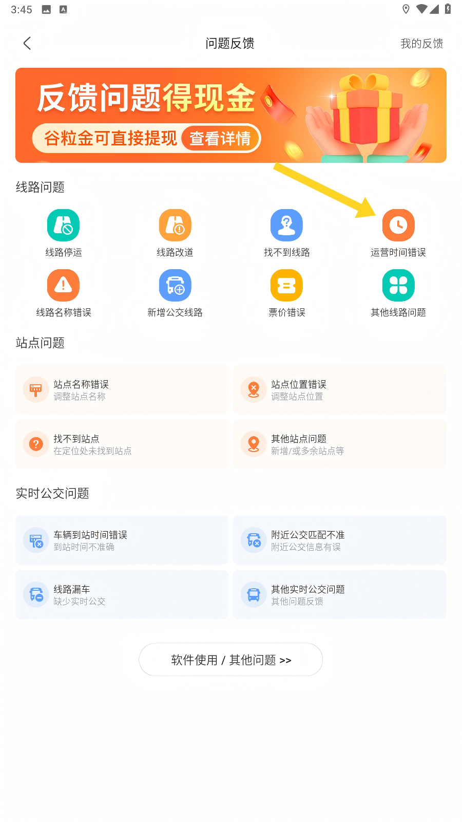 3、进入问题反馈页面后,选择具体问题类型,如【运营时间错误】,精准定位需反馈的问题。