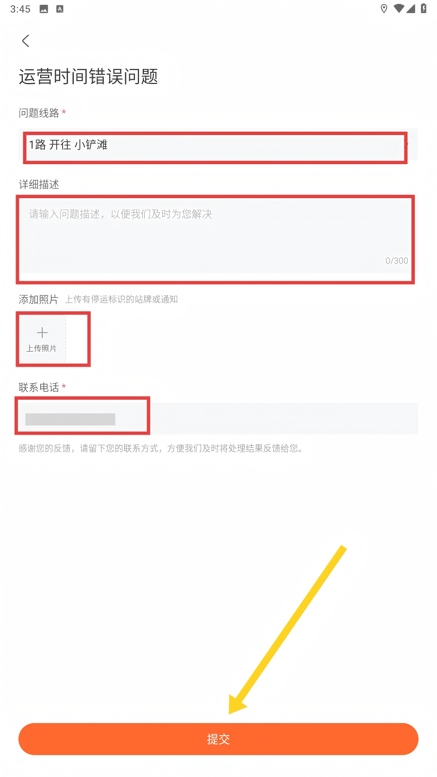 4、填写【问题线路】、【详细描述】,按需上传照片、填写联系电话,点击【提交】,即可完成反馈。