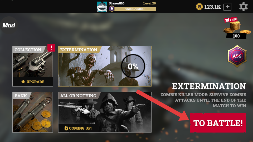 1、在主界面选择【EXTERMINATION】模式后点击【TO-BATTLE!】进入战斗,利用内置菜单可获得武器强化、道具无限等优势。