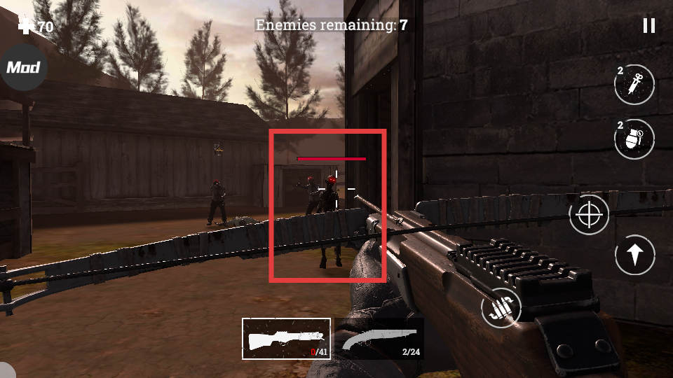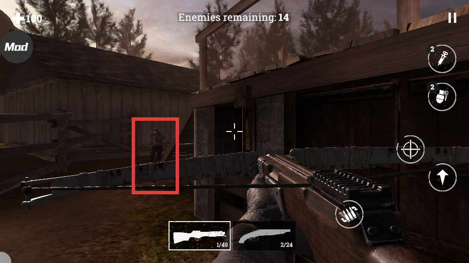 2、进入游戏后,留意上方剩余敌人数量,通过移动控件在场景中寻找僵尸,利用武器精准射击消灭单个僵尸。