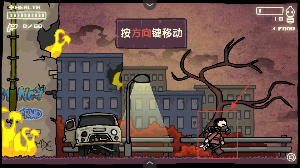 2、在城市场景中,按方向键移动戴防毒面具的角色,注意左上角生命值等状态。