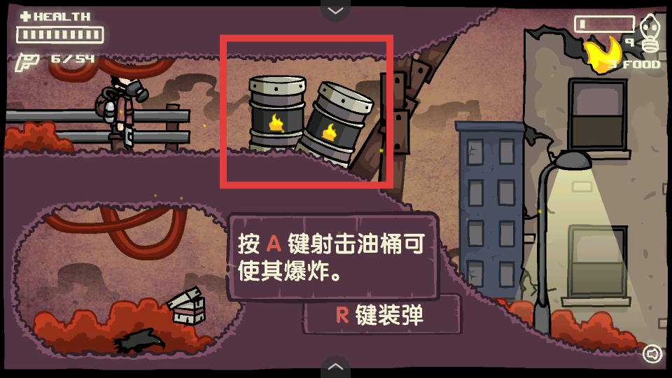 4、看到油桶时,按A键射击可使其爆炸,利用油桶爆炸清理障碍。