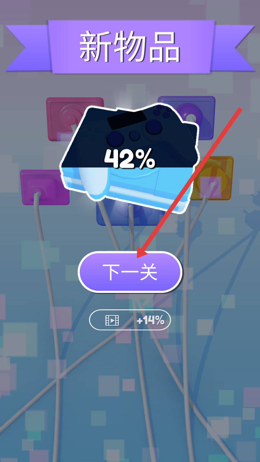 4、点击红色箭头指向的【下一关】按钮,进入下一关。