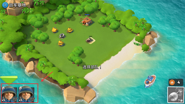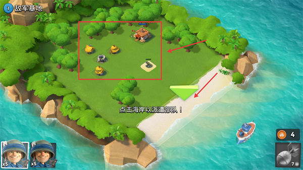 4、点击敌军基地的海岸区域,派遣部队发起进攻,摧毁敌方建筑,获取资源和胜利。