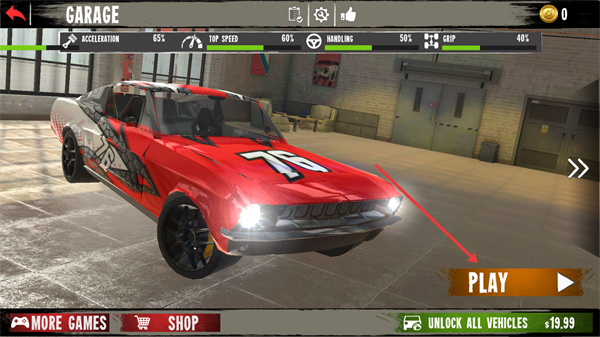 1、在车库界面点击“PLAY”开始比赛,车辆的加速、极速等属性已显示,可通过商店升级车辆,提升比赛竞争力。