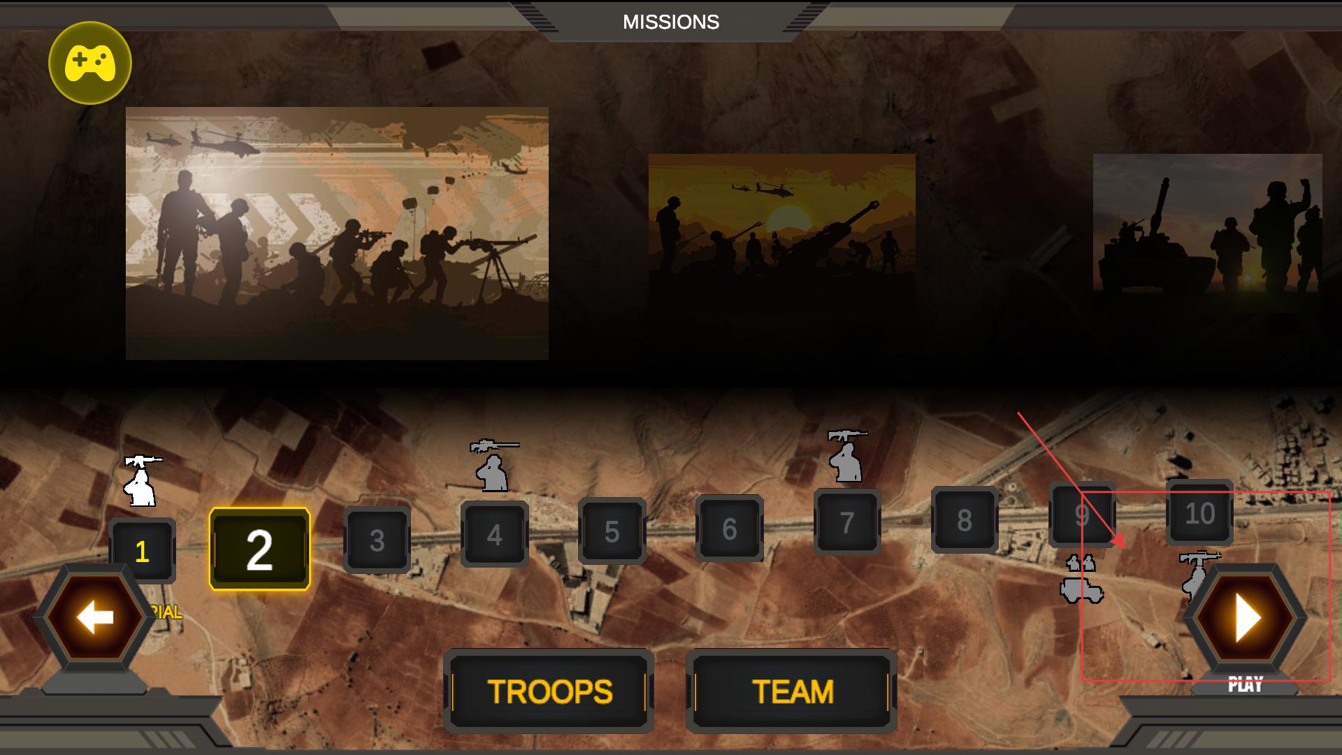 1、在任务选择界面,选择对应关卡后点击【PLAY】进入任务,可提前配置【TROOPS】或【TEAM】以优化作战兵力。