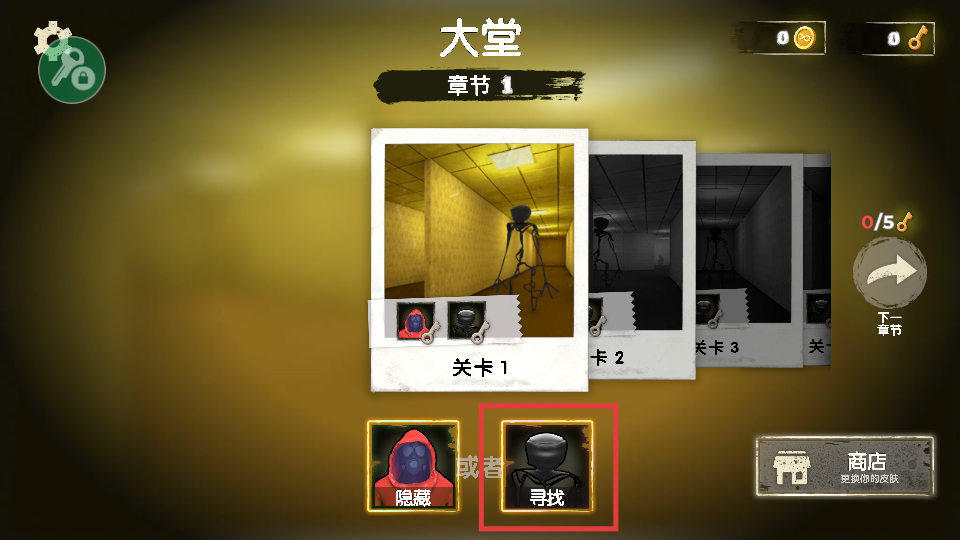 1、选择【寻找】,进入关卡1,开启游戏挑战,在大堂章节中开始探索。