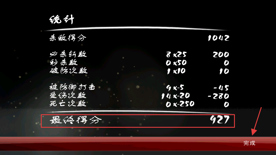 4、战斗结束后查看统计界面的【最终得分】【927】等数据,点击底部完成按钮返回主界面或进入下一关。