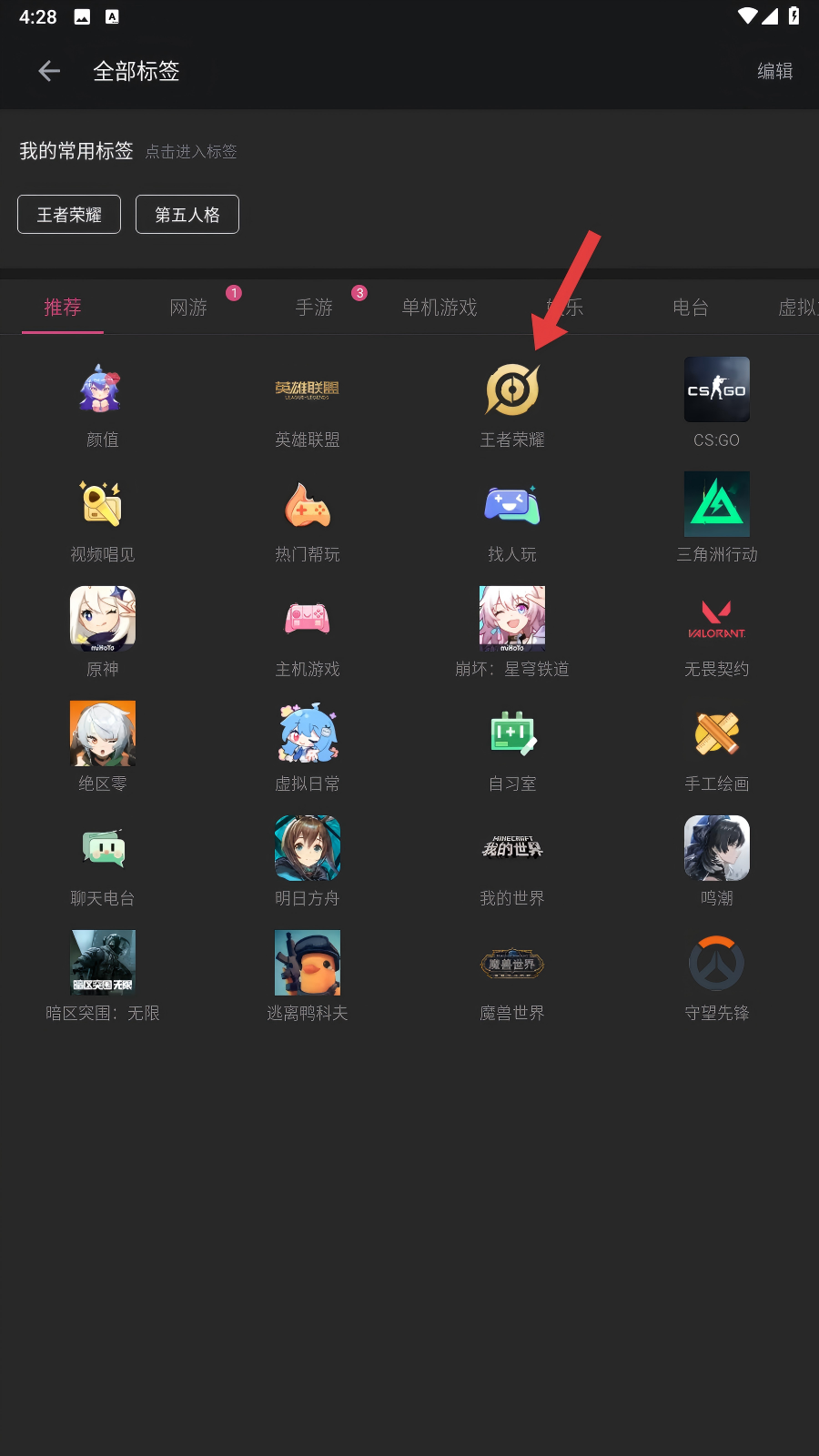 2、在全部标签页面,从推荐的诸多标签里,挑选像【王者荣耀】这类感兴趣的直播标签,点击即可进入对应专区哟。