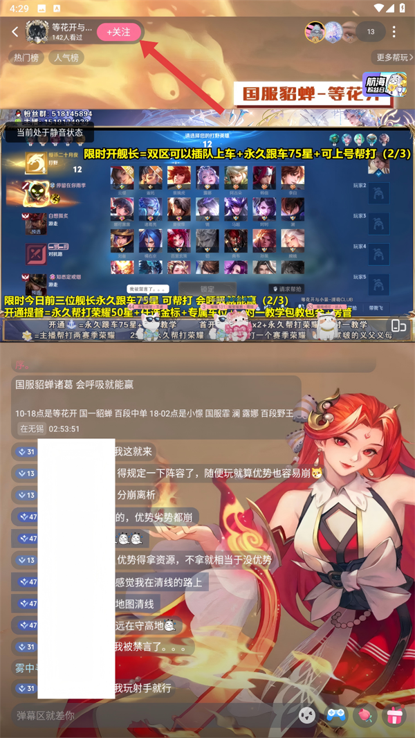 4、进入直播间后,便可观看直播内容,要是喜欢这位主播,点击左上角的【关注】按钮哦。