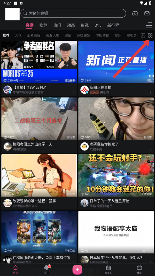 1、打开哔哩哔哩App,进入【直播】页面,点击右上角网格状的全部标签按钮,各类直播标签便一目了然啦。