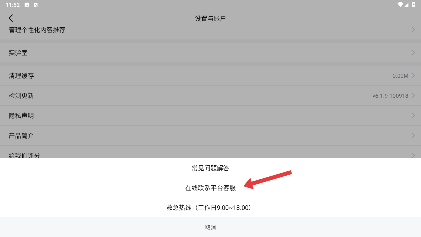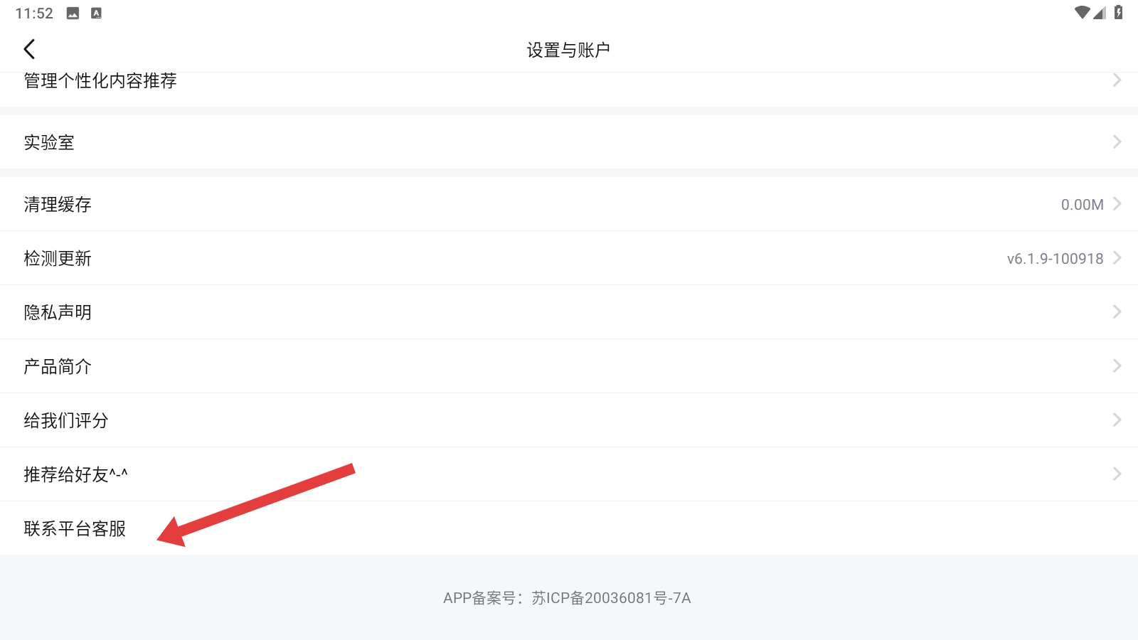 3、进入【设置与账户】后,找到【联系平台客服】选项,点击即可看到客服相关选项哦。