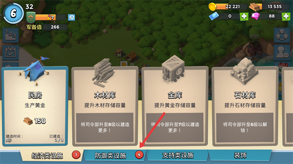 2、在建造功能界面,选择防御类设施。