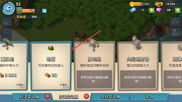3、在防御类设施中选择【地雷】,消耗【20木材】。