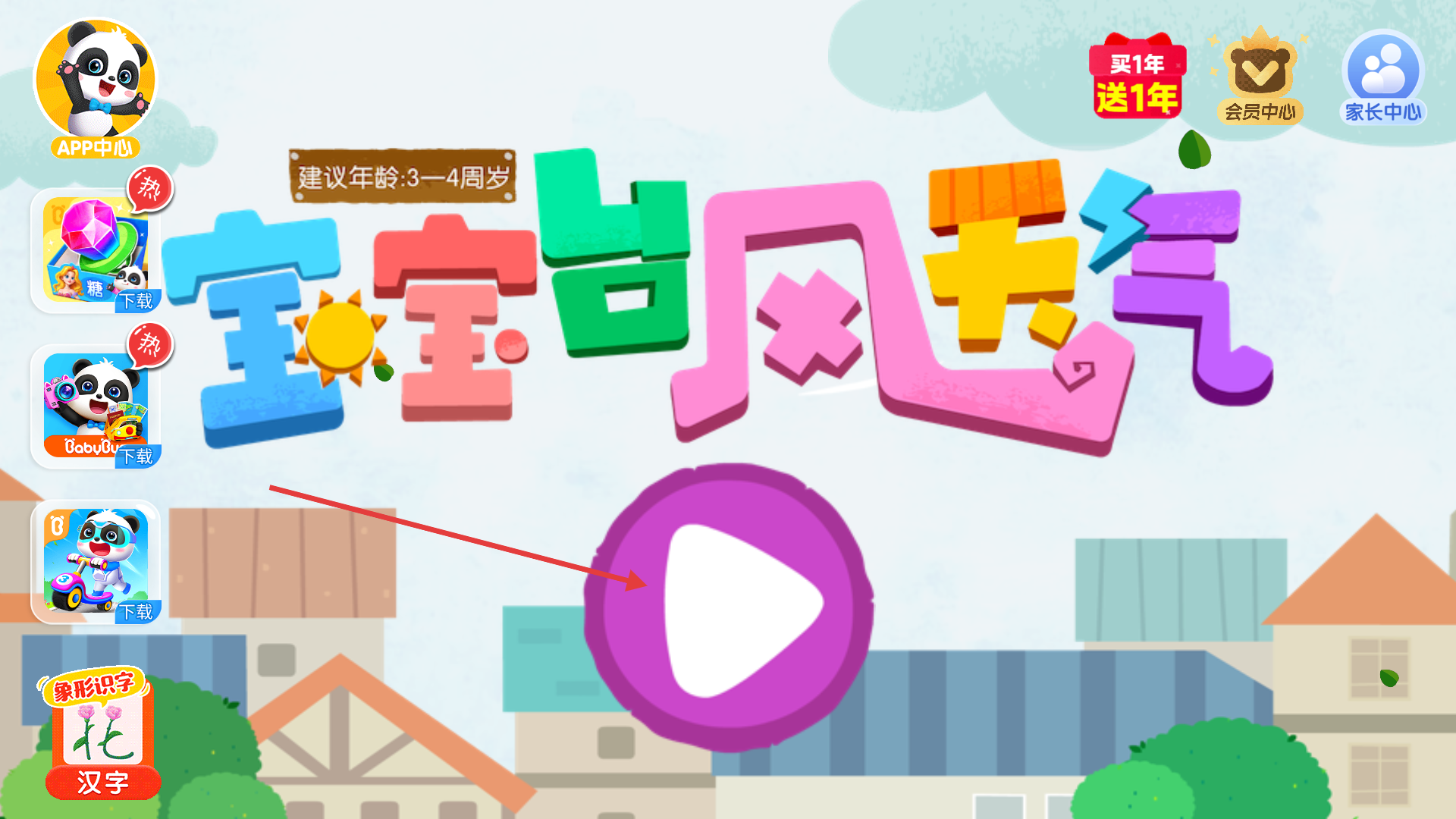 1、点击紫色播放按钮进入游戏,开启针对3-4周岁宝宝的天气认知冒险。