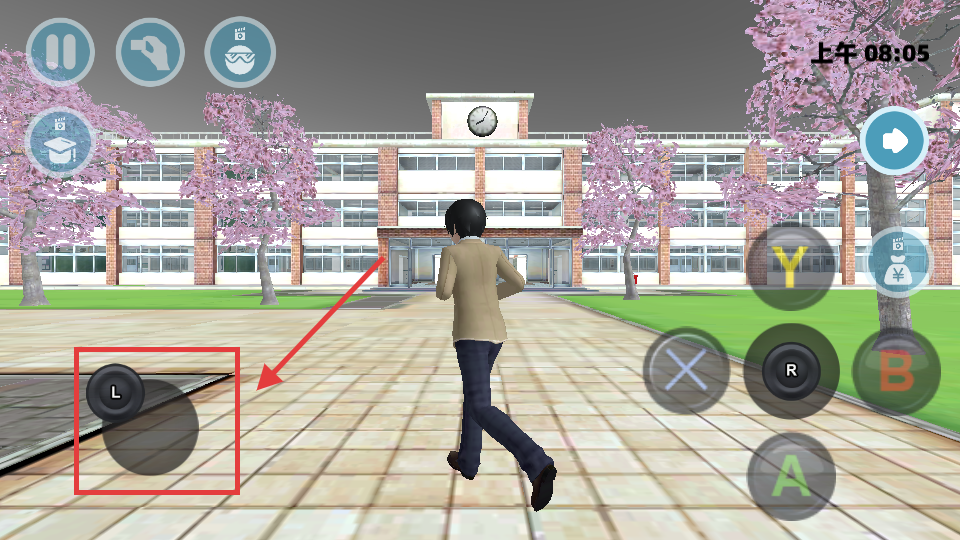 2、利用左侧的【L】按钮控制角色移动方向,在校园场景中跑酷探索,记得关注地图,寻找生存点以便存档复活。