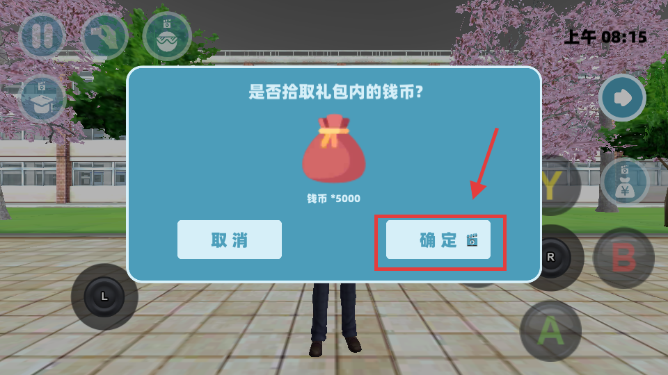 3、遇到礼包钱币拾取弹窗时,点击【确定】按钮,可获得【5000】钱币资源,积累资源有助于后续解锁内容或提升角色。